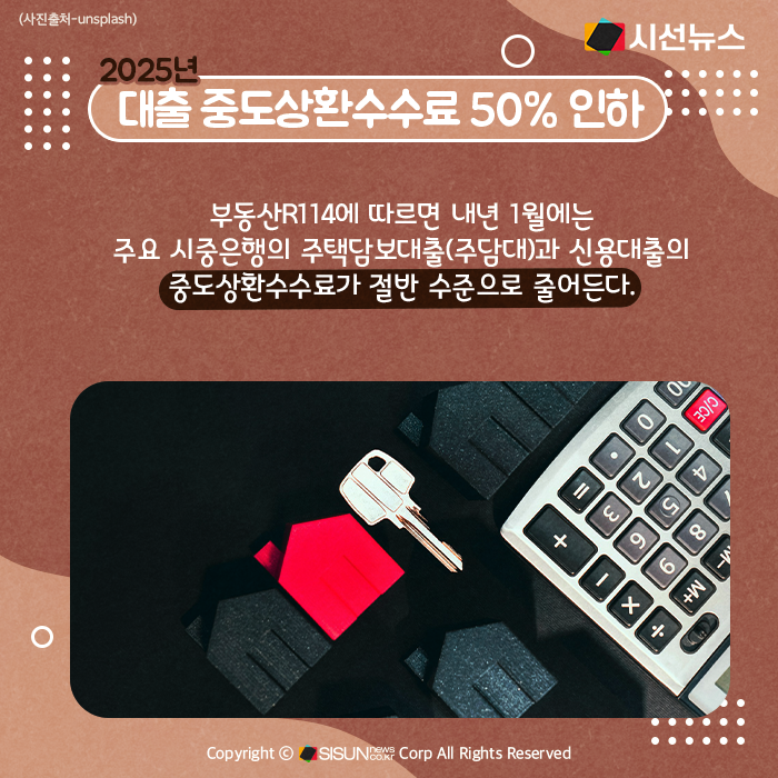 부동산R114에 따르면 내년 1월에는 주요 시중은행의 주택담보대출(주담대)과 신용대출의 중도상환수수료가 절반 수준으로 줄어든다. 현재 5대 시중은행은 주담대는 약 1.2~1.4% 수준, 신용대출은 0.6~0.8% 수준의 중도상환 수수료를 부과하고 있다. 내년부터는 주담대의 경우 0.6~0.7%, 신용대출은 0.4% 수준으로 낮아질 전망이다.