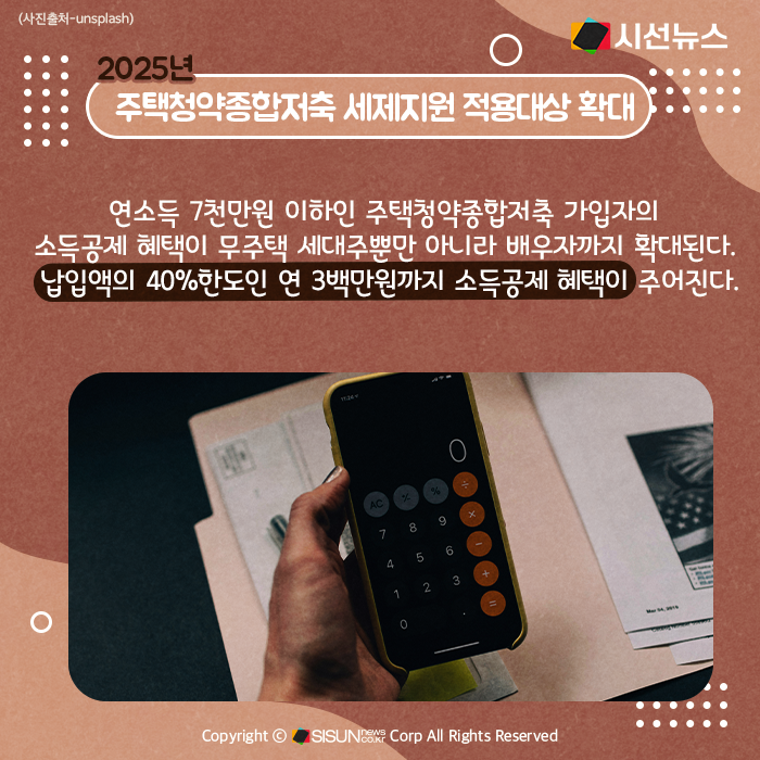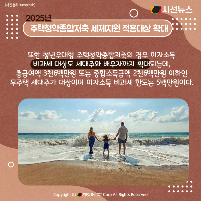 아울러 연소득 7천만원 이하인 주택청약종합저축 가입자의 소득공제 혜택이 무주택 세대주뿐만 아니라 배우자까지 확대된다. 납입액의 40%한도인 연 3백만원까지 소득공제 혜택이 주어진다. 또한 청년우대형 주택청약종합저축의 경우 이자소득 비과세 대상도 세대주와 배우자까지 확대되는데, 총급여액 3천6백만원 또는 종합소득금액 2천6백만원 이하인 무주택 세대주가 대상이며 이자소득 비과세 한도는 5백만원이다.