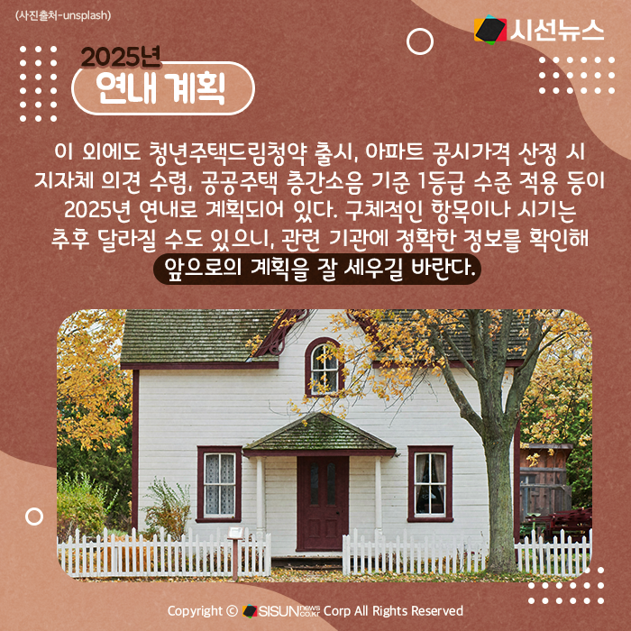 이 외에도 청년주택드림청약 출시, 아파트 공시가격 산정 시 지자체 의견 수렴, 공공주택 층간소음 기준 1등급 수준 적용 등이 2025년 연내로 계획되어 있다. 시행 기간이 연장되는 제도들도 있다. 다만 구체적인 항목이나 시기는 추후 달라질 수도 있으니, 관련 기관에 정확한 정보를 확인해 앞으로의 계획을 잘 세우길 바란다.