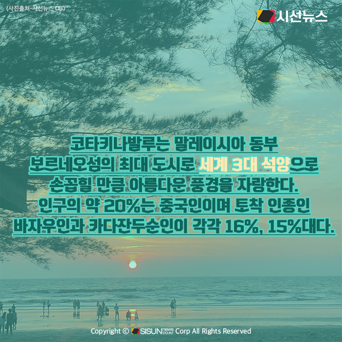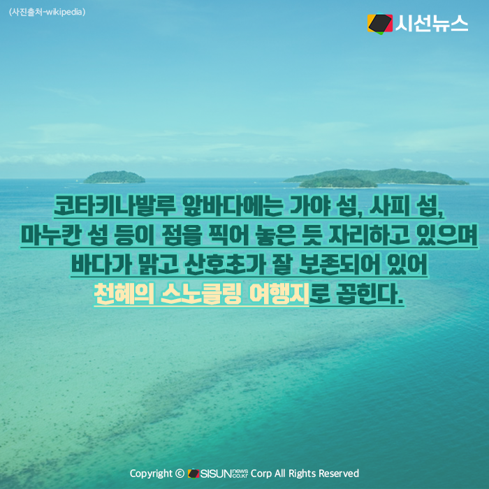 코타키나발루는 말레이시아 동부 보르네오섬의 최대 도시로 세계 3대 석양으로 손꼽힐 만큼 아름다운 풍경을 자랑한다. 인구의 약 20%는 중국인이며 토착 인종인 바자우인과 카다잔두순인이 각각 16%, 15%대다. 코타키나발루 앞바다에는 가야 섬, 사피 섬, 마누칸 섬 등이 점을 찍어 놓은 듯 자리하고 있으며 바다가 맑고 산호초가 잘 보존되어 있어 천혜의 스노클링 여행지로 꼽힌다.