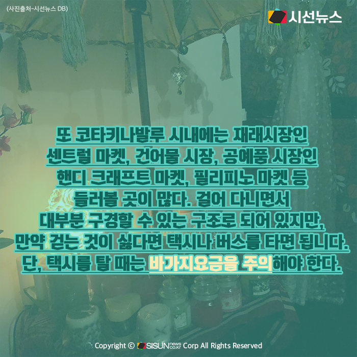 또 코타키나발루 시내에는 재래시장인 센트럴 마켓, 건어물 시장, 공예품 시장인 핸디 크래프트 마켓, 필리피노 마켓 등 들러볼 곳이 많다. 걸어 다니면서 대부분 구경할 수 있는 구조로 되어 있지만, 만약 걷는 것이 싫다면 택시나 버스를 타면 됩니다. 단, 택시를 탈 때는 바가지요금을 주의해야 한다.