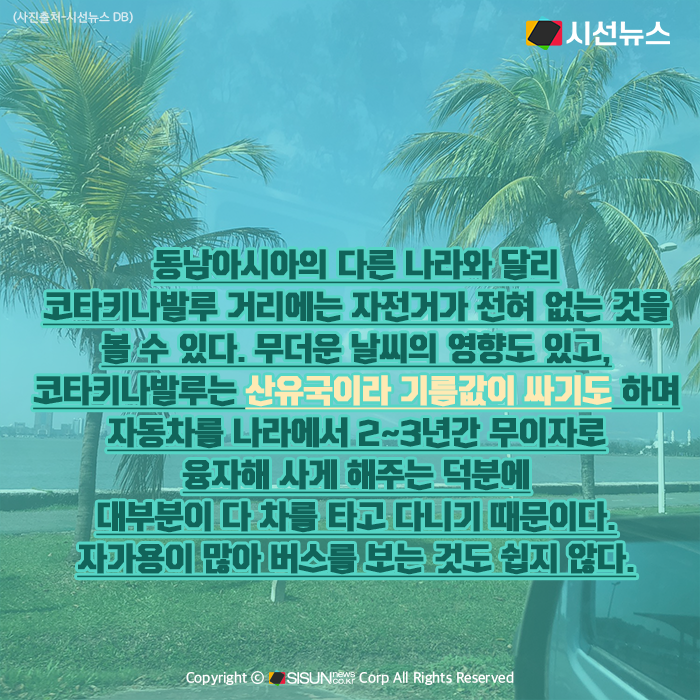 동남아시아의 다른 나라와 달리 코타키나발루 거리에는 자전거가 전혀 없는 것을 볼 수 있다. 무더운 날씨의 영향도 있고, 코타키나발루는 산유국이라 기름값이 싸기도 하며 자동차를 나라에서 2~3년간 무이자로 융자해 사게 해주는 덕분에 대부분이 다 차를 타고 다니기 때문이다. 자가용이 많아 버스를 보는 것도 쉽지 않다.