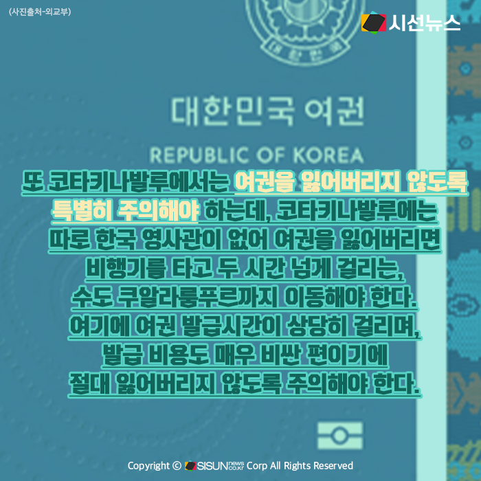 한편 동남아시아 지역답게 음식에 향신료가 많이 들어가기 때문에 우리의 입맛에는 다소 맞지 않을 수 있다. 고수가 샐러드나 국수, 쌀국수 국물 등 많은 곳에 들어가 있는 경우가 많기 때문에 미리 알고 가는 것이 좋다. 또 코타키나발루에서는 여권을 잃어버리지 않도록 특별히 주의해야 하는데, 코타키나발루에는 따로 한국 영사관이 없어 여권을 잃어버리면 비행기를 타고 두 시간 넘게 걸리는, 수도 쿠알라룸푸르까지 이동해야 한다. 여기에 여권 발급시간이 상당히 걸리며, 발급 비용도 매우 비싼 편이기에 절대 잃어버리지 않도록 주의해야 한다.