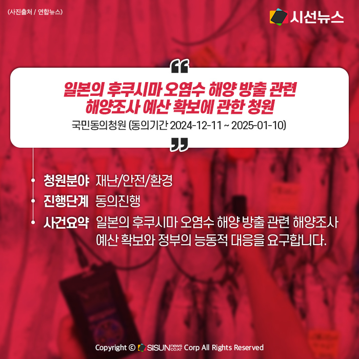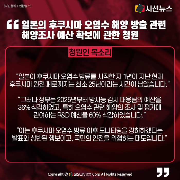 따라서 후쿠시마 오염수 방출 관련 해양조사 예산확보와 방사능대응팀의 인력 증원, 방사능 관련 정부의 능동적인 추적 및 감시를 요구합니다.
