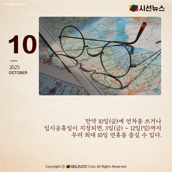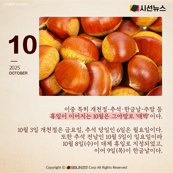 이중 특히 개천절·추석·한글날·주말 등 휴일이 이어지는 10월은 그야말로 ‘대박’이다. 10월 3일 개천절은 금요일, 추석 당일인 6일은 월요일이다. 또한 추석 전날인 10월 5일이 일요일이라 10월 8일(수)이 대체 휴일로 지정되었고, 이어 9일(목)이 한글날이다. 만약 10일(금)에 연차를 쓰거나 임시공휴일이 지정되면, 3일(금) ~ 12일(일)까지 무려 최대 10일 연휴를 즐길 수 있다.