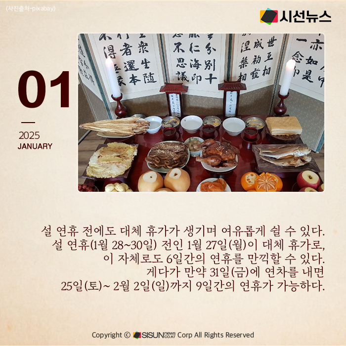 설 연휴 전에도 대체 휴가가 생기며 여유롭게 쉴 수 있다. 설 연휴(1월 28~30일) 전인 1월 27일(월)이 대체 휴가로, 이 자체로도 6일간의 연휴를 만끽할 수 있다. 게다가 만약 31일(금)에 연차를 내면 25일(토)~ 2월 2일(일)까지 9일간의 연휴가 가능하다.