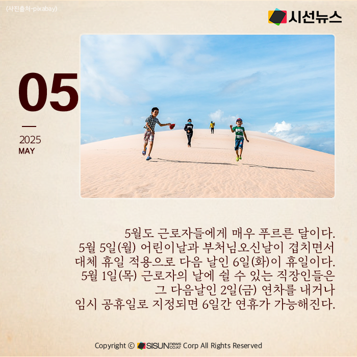5월도 근로자들에게 매우 푸르른 달이다. 5월 5일(월) 어린이날과 부처님오신날이 겹치면서 대체 휴일 적용으로 다음 날인 6일(화)이 휴일이다. 5월 1일(목) 근로자의 날에 쉴 수 있는 직장인들은 그 다음날인 2일(금) 연차를 내거나 임시 공휴일로 지정되면 6일간 연휴가 가능해진다.