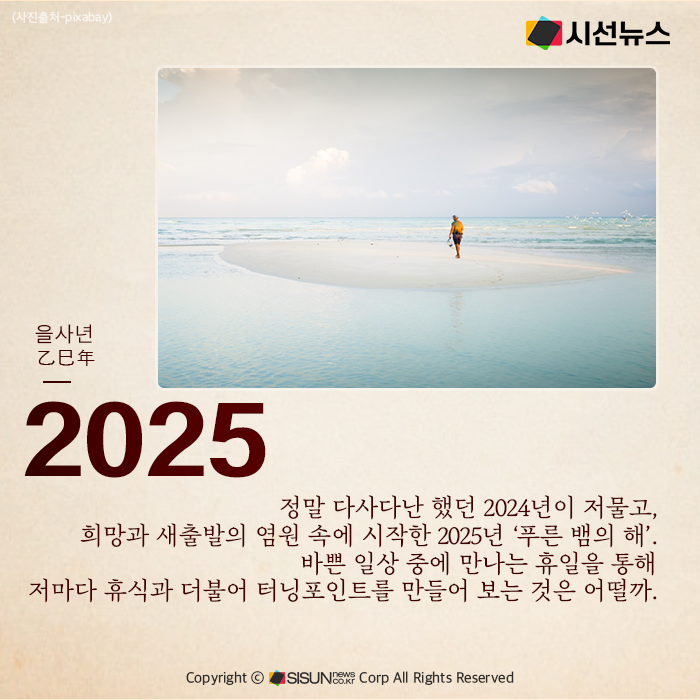 정말 다사다난 했던 2024년이 저물고, 희망과 새출발의 염원 속에 시작한 2025년 ‘푸른 뱀의 해’. 바쁜 일상 중에 만나는 휴일을 통해 저마다 휴식과 더불어 터닝포인트를 만들어 보는 것은 어떨까.