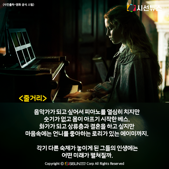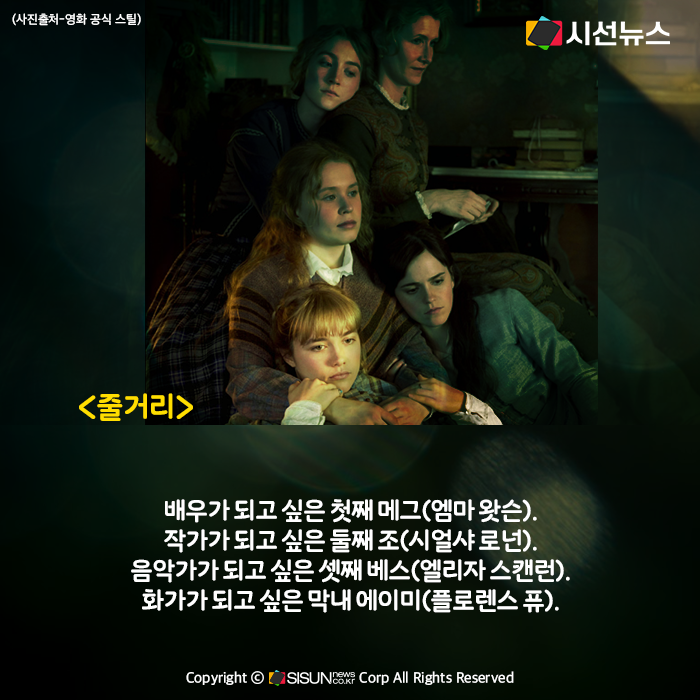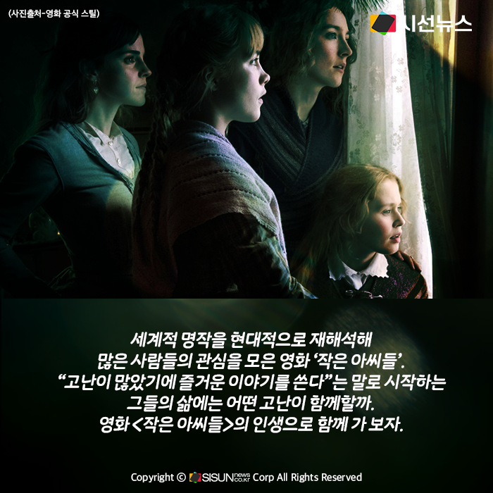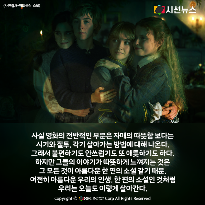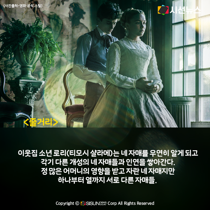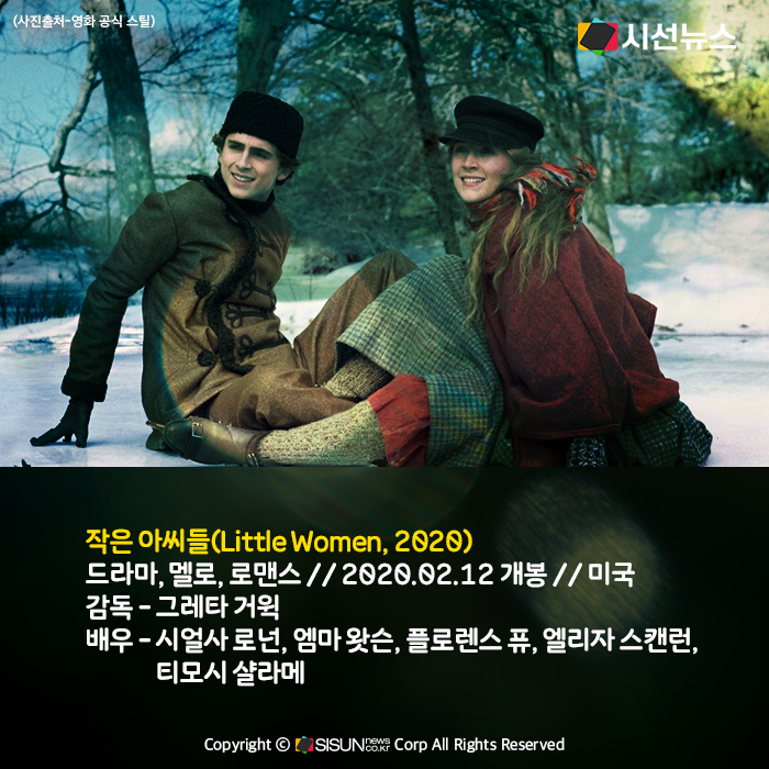 시선뉴스=박진아 기자ㅣ가족과 함께 할 때, 혼자서 울고 싶을 때, 사랑하는 연인과 로맨스를 한껏 더 즐기고 싶을 때, 당신은 어떤 영화를 선택하나요? 많은 영화들 속에서 결정을 내리기 어려운 당신에게 영화를 추천, 요리합니다. 오늘의 영화는 ‘작은 아씨들(Little Women, 2020)’입니다.