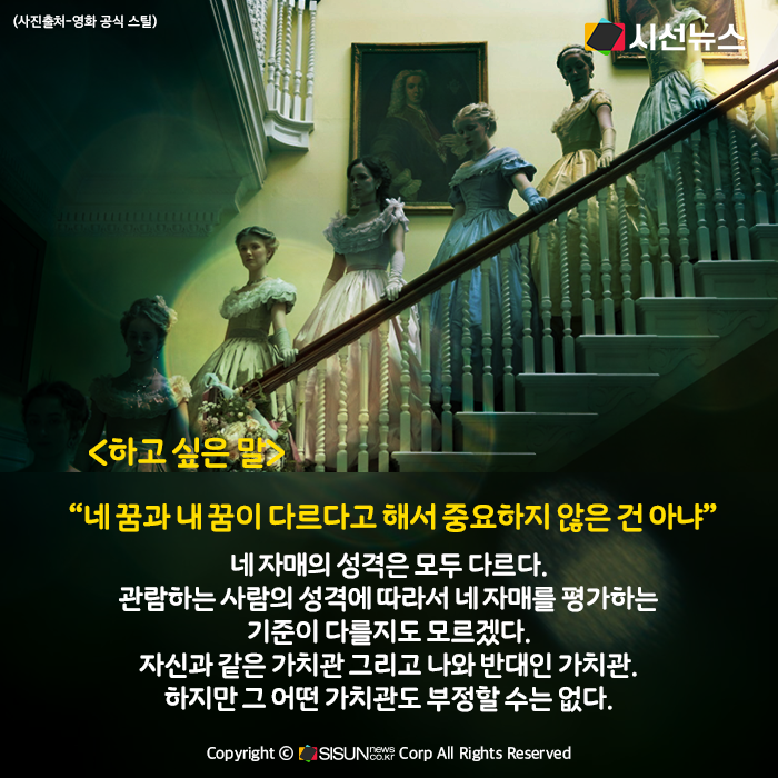 네 자매의 성격은 모두 다르다. 관람하는 사람의 성격에 따라서 네 자매를 평가하는 기준이 다를지도 모르겠다. 자신과 같은 가치관 그리고 나와 반대인 가치관. 하지만 그 어떤 가치관도 부정할 수는 없다. 누구의 삶이 더 옳고 그른지도 파악할 수 없다. 어떤 삶이 더 행복하다고 단정 지을 수도 없다. 모두 이해할 수 있는 삶들이기 때문이다. 나는 어떤 꿈을 바라고 어떤 삶을 추구하는가.