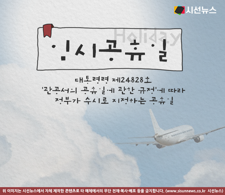 임시공휴일이란, 대통령령 제24828호 '관공서의 공휴일에 관한 규정'에 따라 정부가 수시로 지정하는 공휴일을 말한다. 임시공휴일은 필요에 따라 국무회의의 심의와 의결을 통해 결정된다. 하지만 모든 근로자가 쉬지는 않는다. 우선, 관공서에 해당하는 국가 기관, 지방자치단체의 기관, 공공기관 등은 법적 효력을 받아 의무적으로 휴무한다. 하지만 일반 기업의 경우 '근로기준법'에 따라 공휴일을 부여받으므로 임시공휴일에 휴무하지 않을 수 있고, 각 사의 취업규칙에 따라 휴무 여부가 달라진다.
