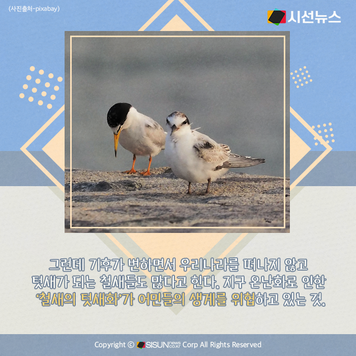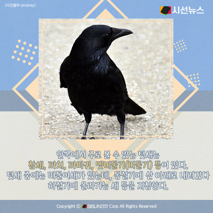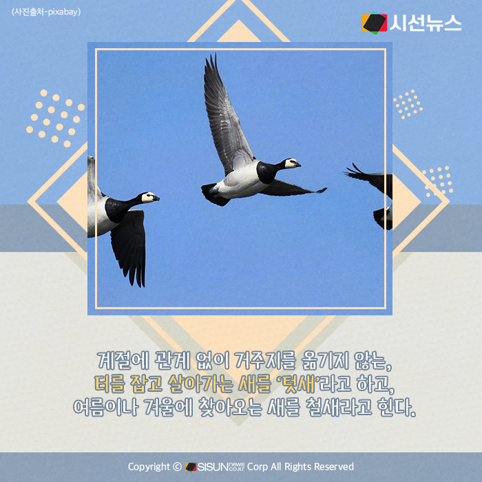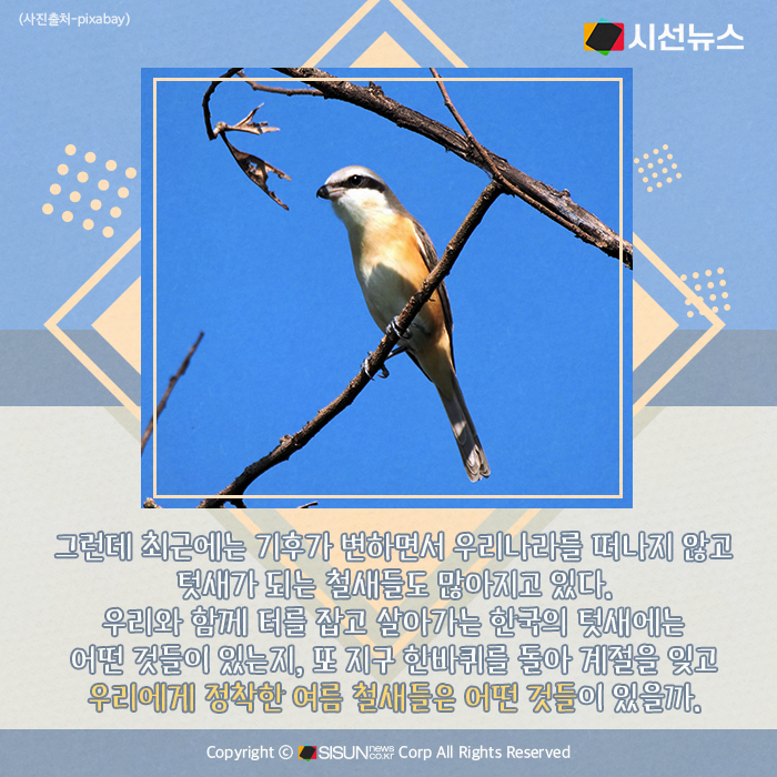 시선뉴스=박진아 기자 / 디자인=김선희 proㅣ계절에 관계 없이 거주지를 옮기지 않는, 터를 잡고 살아가는 새를 ‘텃새’라고 하고, 여름이나 겨울에 찾아오는 새를 철새라고 한다. 그런데 최근에는 기후가 변하면서 우리나라를 떠나지 않고 텃새가 되는 철새들도 많아지고 있다. 우리와 함께 터를 잡고 살아가는 한국의 텃새에는 어떤 것들이 있는지, 또 지구 한바퀴를 돌아 계절을 잊고 우리에게 정착한 여름 철새들은 어떤 것들이 있을까.