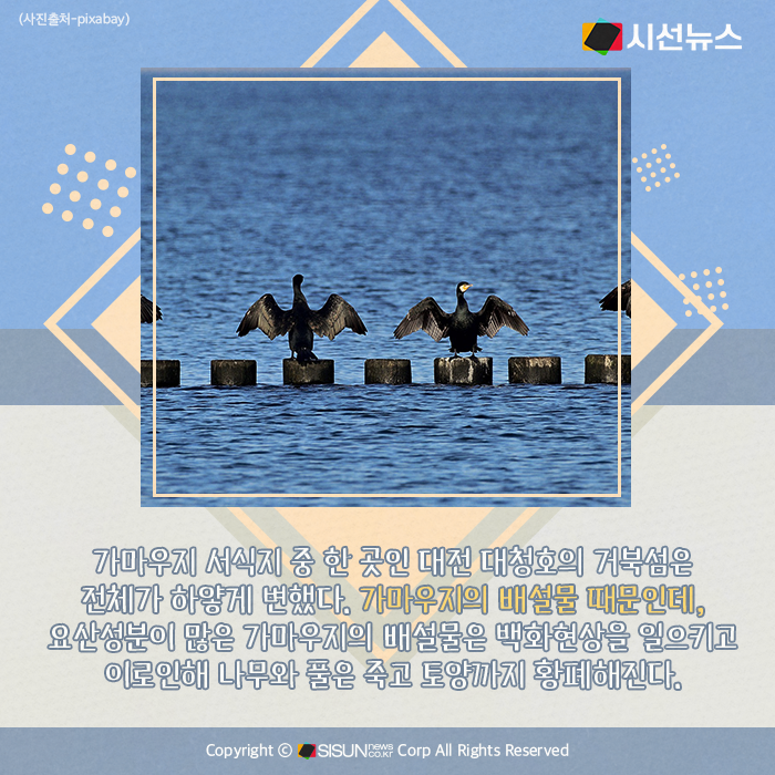 가마우지 서식지 중 한 곳인 대전 대청호의 거북섬은 전체가 하얗게 변했다. 가마우지의 배설물 때문인데, 요산성분이 많은 가마우지의 배설물은 백화현상을 일으키고 이로인해 나무와 풀은 죽고 토양까지 황폐해진다.