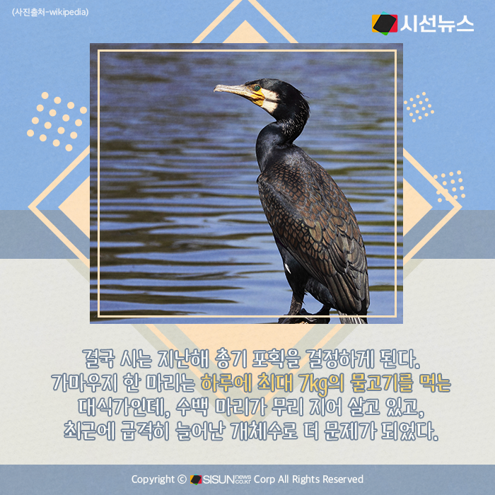 피해가 점차 커지고 있어서 대책이 필요하지만 아직까지 현실성 있는 대책이 마련되지 않고 있는 실정이다. 어떤 철새들이 어떤 피해를 주고 있는 것일까. 어민들에 가장 큰 피해를 주는 철새 중 하나는 가마우지다. 민물 가마우지는 약 1m에 달하는 크기의 검정몸짓의 새 인데, 원래는 겨울 철새인데 최근에는 텃새로 변하면서 개체 수가 급증하면서 가마우지가 골칫거리가 되고 있다.