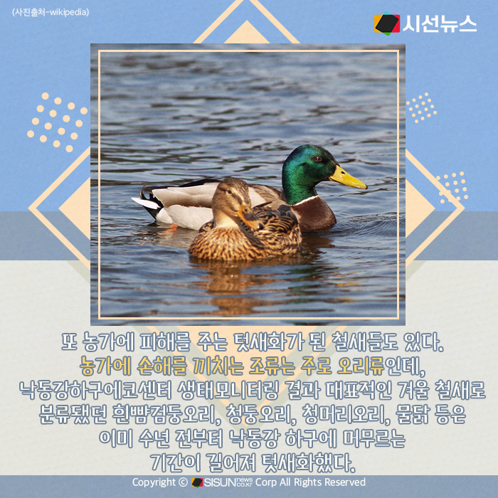 결국 시는 지난해 총기 포획을 결정하게 된다. 가마우지 한 마리는 하루에 최대 7kg의 물고기를 먹는 대식가인데, 수백 마리가 무리 지어 살고 있고, 최근에 급격히 늘어난 개체수로 더 문제가 되었다. 또 농가에 피해를 주는 텃새화가 된 철새들도 있다. 농가에 손해를 끼치는 조류는 주로 오리류인데, 낙동강하구에코센터 생태모니터링 결과 대표적인 겨울 철새로 분류됐던 흰뺨검둥오리, 청둥오리, 청머리오리, 물닭 등은 이미 수년 전부터 낙동강 하구에 머무르는 기간이 길어져 텃새화했다. 이들은 모내기를 갓 마무리한 논에 날아들어 먹이 활동을 하며 뿌리가 온전히 내리지 않은 모를 뽑아 손해를 끼치고 있다.