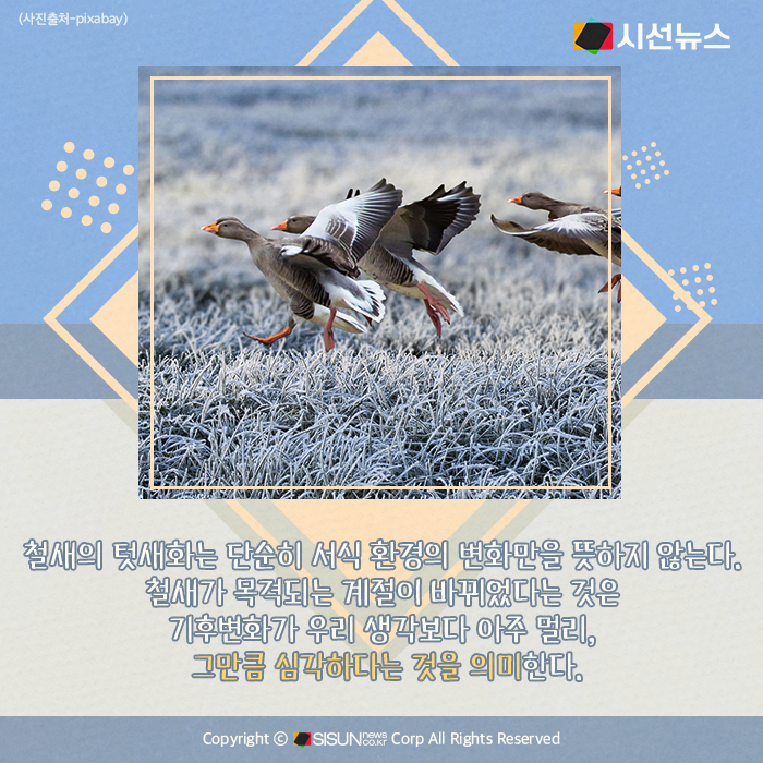 철새의 텃새화는 단순히 서식 환경의 변화만을 뜻하지 않는다. 철새가 목격되는 계절이 바뀌었다는 것은 기후변화가 우리 생각보다 아주 멀리, 그만큼 심각하다는 것을 의미한다.