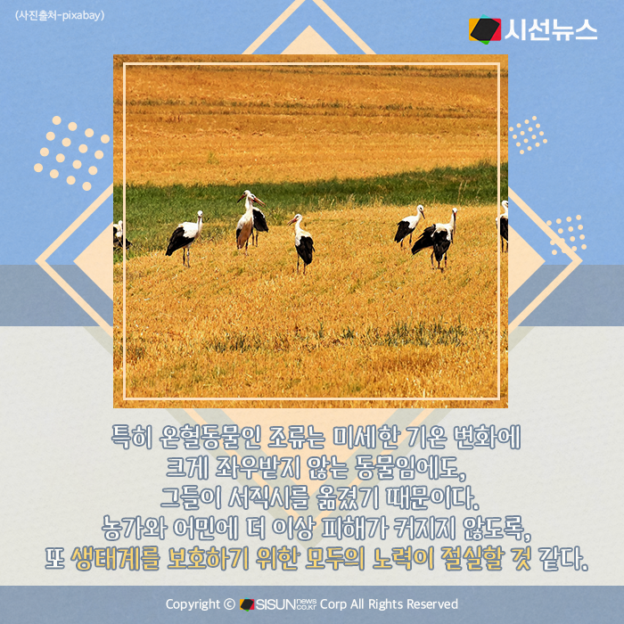 특히 온혈동물인 조류는 미세한 기온 변화에 크게 좌우받지 않는 동물임에도, 그들이 서직시를 옮겼기 때문이다. 농가와 어민에 더 이상 피해가 커지지 않도록, 또 생태계를 보호하기 위한 모두의 노력이 절실할 것 같다.