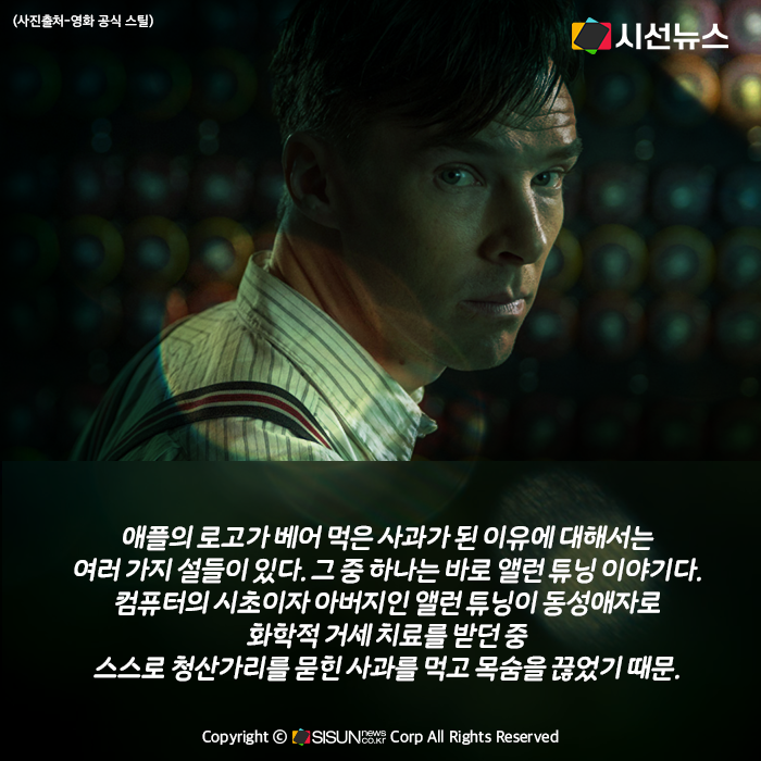 시선뉴스=박진아 기자ㅣ애플의 로고가 베어 먹은 사과가 된 이유에 대해서는 여러 가지 설들이 있다. 그 중 하나는 바로 앨런 튜닝 이야기다. 컴퓨터의 시초이자 아버지인 앨런 튜닝이 동성애자로 화학적 거세 치료를 받던 중 스스로 청산가리를 묻힌 사과를 먹고 목숨을 끊었기 때문. 그리고 훗날 이 상징적인 사과는 세계를 이끈 스티브잡스의 애플사 로고가 된다. 비운의 천재수학자 이야기, 영화 <이미테이션 게임>에서 살펴볼 수 있다.