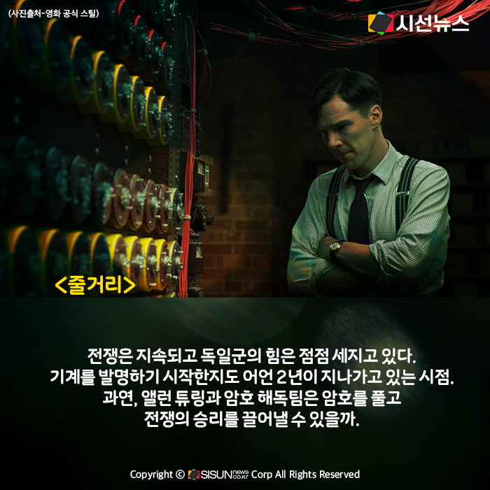절대 사람의 힘으로 풀 수 없다고 판단한 천재 수학자 앨런 튜링(베네딕트 컴버배치)은 암호 해독을 위한 특별한 기계를 발명하기로 한다. 어마어마한 비용이 들고 아무도 이해하지 않았지만 앨런 튜링은 자신의 신념으로 기계를 발명하기 시작한다. 하지만 암호를 해독하는데 주어지는 시간은 고작 24시간. 암호는 24시간마다 바뀌는 체계를 가졌기 때문... 전쟁은 지속되고 독일군의 힘은 점점 세지고 있다. 기계를 발명하기 시작한지도 어언 2년이 지나가고 있는 시점. 과연, 앨런 튜링과 암호 해독팀은 암호를 풀고 전쟁의 승리를 끌어낼 수 있을까.