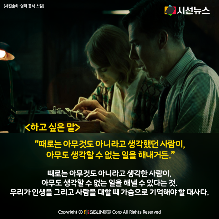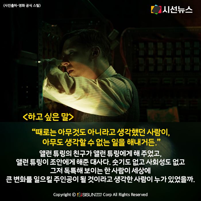 앨런 튜링의 친구가 앨런 튜링에게 해 주었고, 앨런 튜링이 조안에게 해준 대사다. 숫기도 없고 사회성도 없고 그저 독특해 보이는 한 사람이 세상에 큰 변화를 일으킬 주인공이 될 것이라고 생각한 사람이 누가 있었을까. 때로는 아무것도 아니라고 생각한 사람이, 아무도 생각할 수 없는 일을 해낼 수 있다는 것. 우리가 인생을 그리고 사람을 대할 때 가슴으로 기억해야 할 대사다. 앨런 튜닝 교수의 유년시절. 그리고 그의 20대. 그리고 현재와 과거를 넘나드는 서사적 구조. 또 과거를 회상하는 담담한 앨런의 회고들.