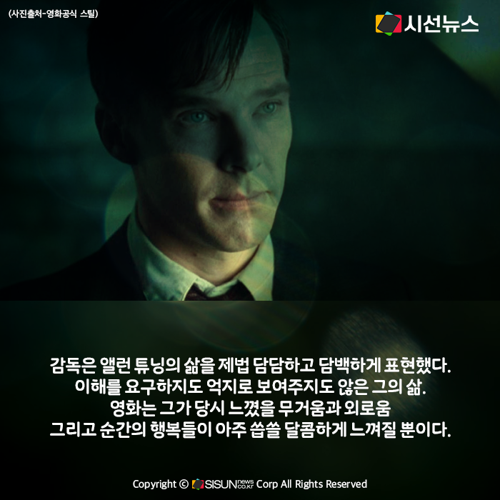 감독은 앨런 튜닝의 삶을 제법 담담하고 담백하게 표현했다. 이해를 요구하지도 억지로 보여주지도 않은 그의 삶. 영화는 그가 당시 느꼈을 무거움과 외로움 그리고 순간의 행복들이 아주 씁쓸 달콤하게 느껴질 뿐이다.