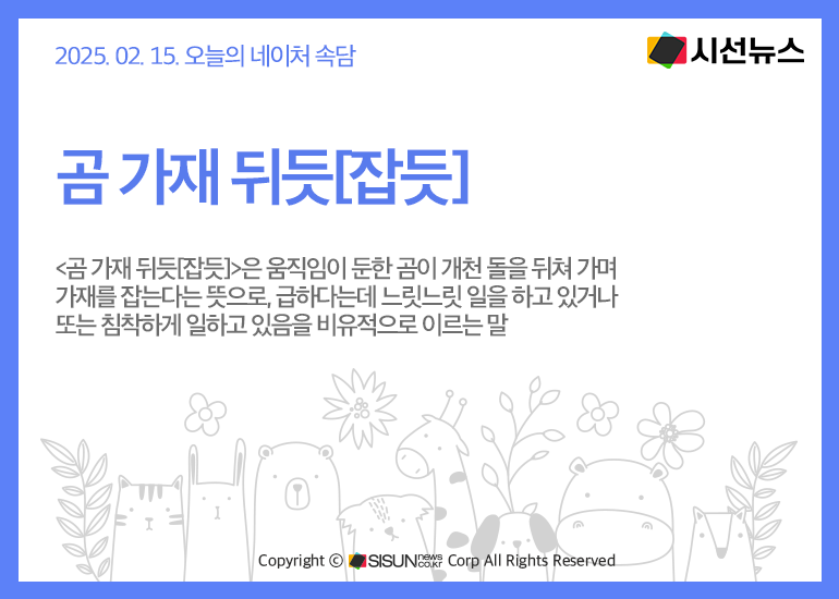 <곰 가재 뒤듯[잡듯]>은 움직임이 둔한 곰이 개천 돌을 뒤쳐 가며 가재를 잡는다는 뜻으로, 급하다는데 느릿느릿 일을 하고 있거나 또는 침착하게 일하고 있음을 비유적으로 이르는 말입니다.