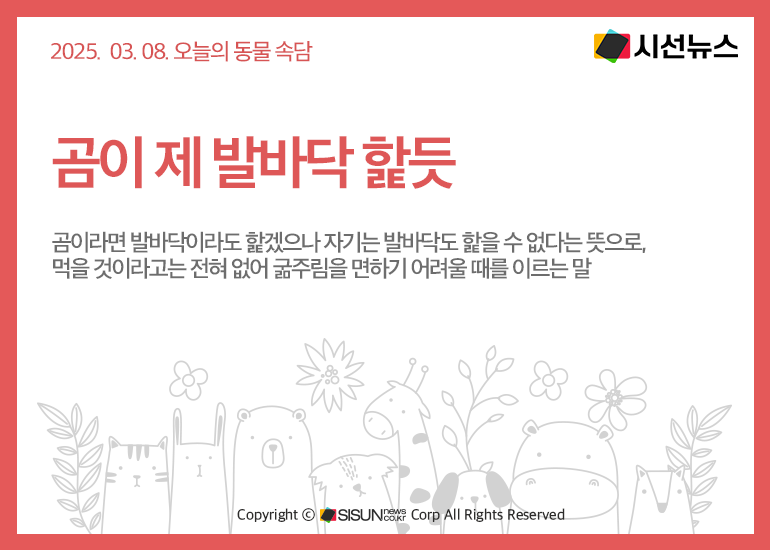 <곰이 제 발바닥 핥듯>은 곰이라면 발바닥이라도 핥겠으나 자기는 발바닥도 핥을 수 없다는 뜻으로, 먹을 것이라고는 전혀 없어 굶주림을 면하기 어려울 때를 이르는 말입니다.