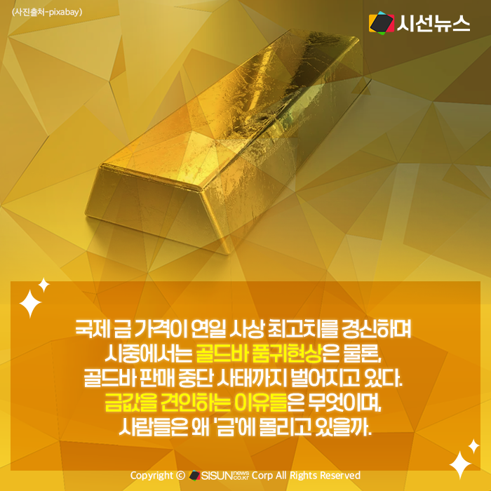 시선뉴스=양원민 기자ㅣ국제 금 가격이 연일 사상 최고치를 경신하며 시중에서는 골드바 품귀현상은 물론, 골드바 판매 중단 사태까지 벌어지고 있다. 금값을 견인하는 이유들은 무엇이며, 사람들은 왜 ‘금’에 몰리고 있을까.