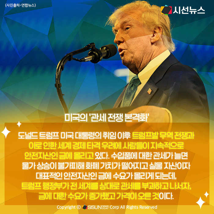 도널드 트럼프 미국 대통령의 취임 이후 트럼프발 무역 전쟁과 이로 인한 세계 경제 타격 우려에 사람들이 지속적으로 안전자산인 금에 몰리고 있다. 수입품에 대한 관세가 늘면 물가 상승이 불가피해 화폐 가치가 떨어지고 실물 자산이자 대표적인 안전자산인 금에 수요가 몰리게 되는데, 트럼프 행정부가 전 세계를 상대로 관세를 부과하고 나서자, 금에 대한 수요가 증가했고 가격이 올랐다.