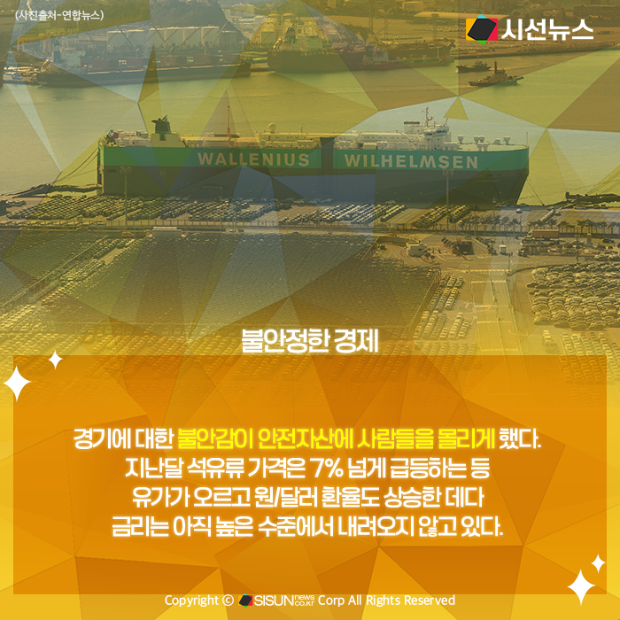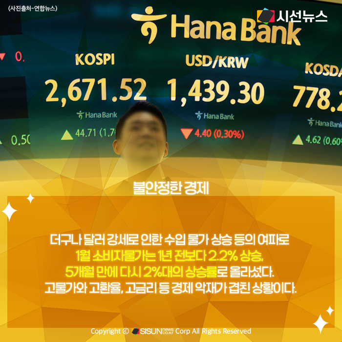 경기에 대한 불안감이 안전자산에 사람들을 몰리게 했다. 지난달 석유류 가격은 7% 넘게 급등하는 등 유가가 오르고 원/달러 환율도 상승한 데다 금리는 아직 높은 수준에서 내려오지 않고 있다. 더구나 달러 강세로 인한 수입 물가 상승 등의 여파로 1월 소비자물가는 1년 전보다 2.2% 상승, 5개월 만에 다시 2%대의 상승률로 올라섰다. 고물가와 고환율, 고금리 등 경제 악재가 겹친 상황이다.