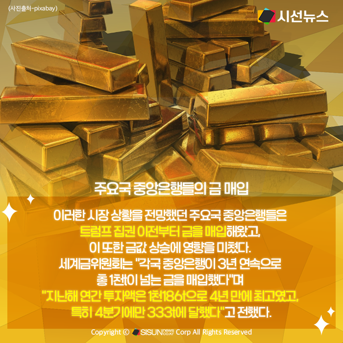 이러한 시장 상황을 전망했던 주요국 중앙은행들은 트럼프 집권 이전부터 금을 매입해왔고, 이 또한 금값 상승에 영향을 미쳤다. 세계금위원회는 “각국 중앙은행이 3년 연속으로 총 1천t이 넘는 금을 매입했다”며 “지난해 연간 투자액은 1천186t으로 4년 만에 최고였고, 특히 4분기에만 333t에 달했다”고 전했다.