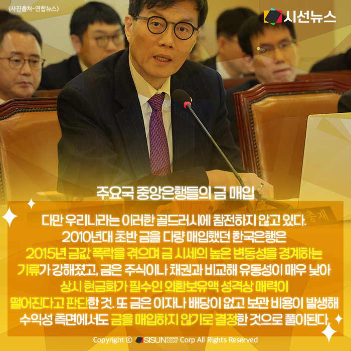 다만 우리나라는 이러한 골드러시에 참전하지 않고 있다. 2010년대 초반 금을 다량 매입했던 한국은행은 2015년 금값 폭락을 겪으며 금 시세의 높은 변동성을 경계하는 기류가 강해졌고, 금은 주식이나 채권과 비교해 유동성이 매우 낮아 상시 현금화가 필수인 외환보유액 성격상 매력이 떨어진다고 판단한 것이다. 외에도 금은 이자나 배당이 없고 보관 비용까지 발생한다는 단점이 있어 수익성 측면에서도 금을 매입하지 않기로 결정한 것으로 풀이된다.