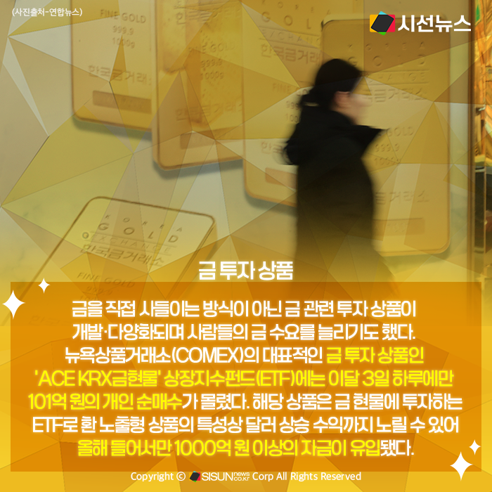 금을 직접 사들이는 방식이 아닌 금 관련 투자 상품이 개발·다양화되며 사람들의 금 수요를 늘리기도 했다. 뉴욕상품거래소(COMEX)의 대표적인 금 투자 상품인 ‘ACE KRX금현물’ 상장지수펀드(ETF)에는 이달 3일 하루에만 101억 원의 개인 순매수가 몰렸다. 해당 상품은 금 현물에 투자하는 ETF로 환 노출형 상품의 특성상 달러 상승 수익까지 노릴 수 있어 올해 들어서만 1000억 원 이상의 자금이 유입됐다.