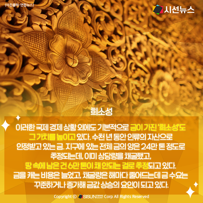 이러한 국제 경제 상황 외에도 기본적으로 금이 가진 ‘희소성’도 그 가치를 높이고 있다. 수천 년 동안 인류의 자산으로 인정받고 있는 금. 지구에 있는 전체 금의 양은 24만 톤 정도로 추정되는데, 이미 상당량을 채굴했고, 땅 속에 남은 건 6만 톤이 채 안되는 걸로 추정되고 있다. 금을 캐는 비용은 늘었고, 채굴량은 해마다 줄어드는데 금 수요는 꾸준하거나 증가해 금값 상승의 요인이 되고 있다.