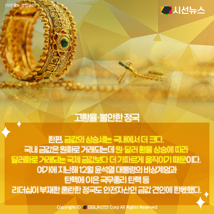 한편, 금값의 상승세는 국내에서 더 크다. 국내 금값은 원화로 거래되는데 원·달러 환율 상승에 따라 달러화로 거래되는 국제 금값보다 더 가파르게 움직이기 때문이다. 여기에 지난해 12월 윤석열 대통령의 비상계엄과 탄핵에 이은 국무총리 탄핵 등 리더십이 부재한 혼란한 정국도 안전자산인 금값 견인에 한몫했다.