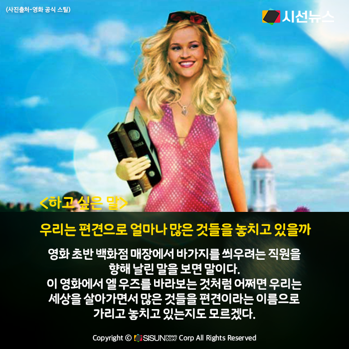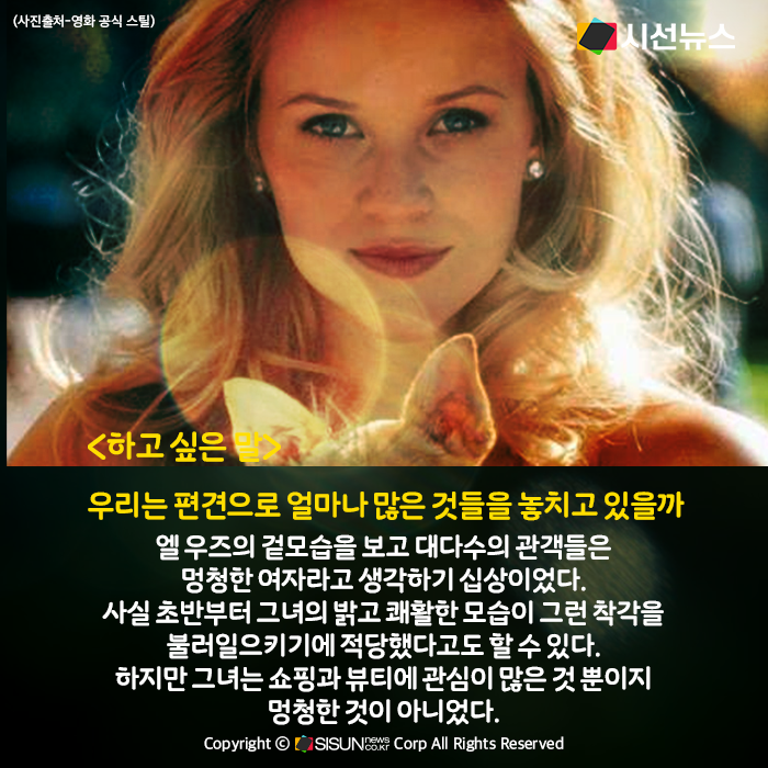 엘 우즈의 겉모습을 보고 대다수의 관객들은 멍청한 여자라고 생각하기 십상이었다. 사실 초반부터 그녀의 밝고 쾌활한 모습이 그런 착각을 불러일으키기에 적당했다고도 할 수 있다. 하지만 그녀는 쇼핑과 뷰티에 관심이 많은 것 뿐이지 멍청한 것이 아니었다. 영화 초반 백화점 매장에서 바가지를 씌우려는 직원을 향해 날린 말을 보면 말이다. 이 영화에서 엘 우즈를 바라보는 것처럼 어쩌면 우리는 세상을 살아가면서 많은 것들을 편견이라는 이름으로 가리고 놓치고 있는지도 모르겠다.
