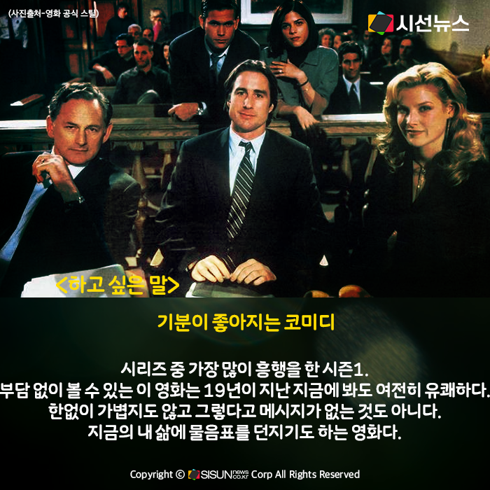 시리즈 중 가장 많이 흥행을 한 시즌1. 부담 없이 볼 수 있는 이 영화는 19년이 지난 지금에 봐도 여전히 유쾌하다. 한없이 가볍지도 않고 그렇다고 메시지가 없는 것도 아니다. 지금의 내 삶에 물음표를 던지기도 하는 영화다.