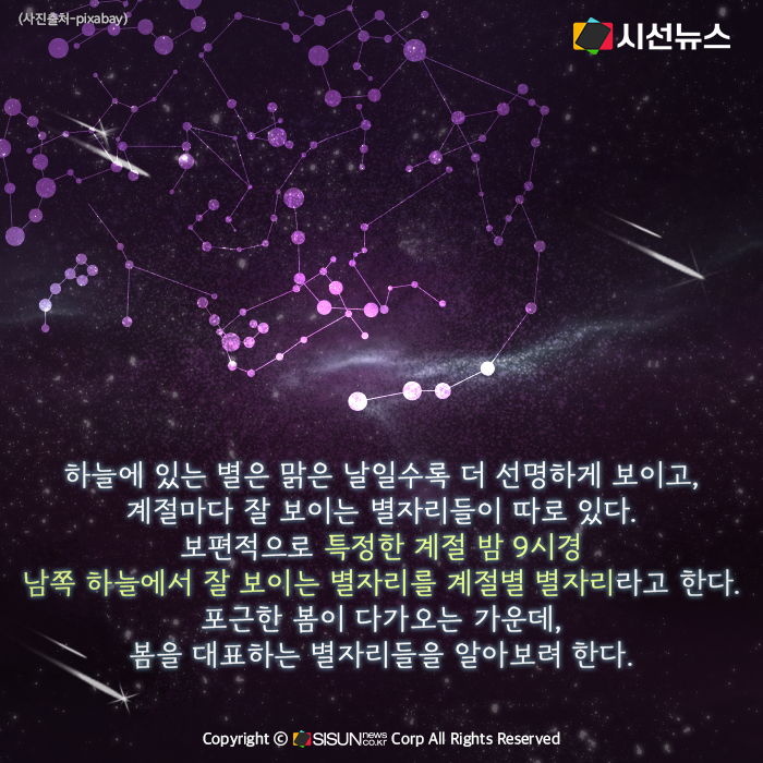 시선뉴스=정혜인 기자ㅣ하늘에 있는 별은 맑은 날일수록 더 선명하게 보이고, 계절마다 잘 보이는 별자리들이 따로 있다. 보편적으로 특정한 계절 밤 9시경 남쪽 하늘에서 잘 보이는 별자리를 계절별 별자리라고 한다. 포근한 봄이 다가오는 가운데, 봄을 대표하는 별자리들을 알아보려 한다.