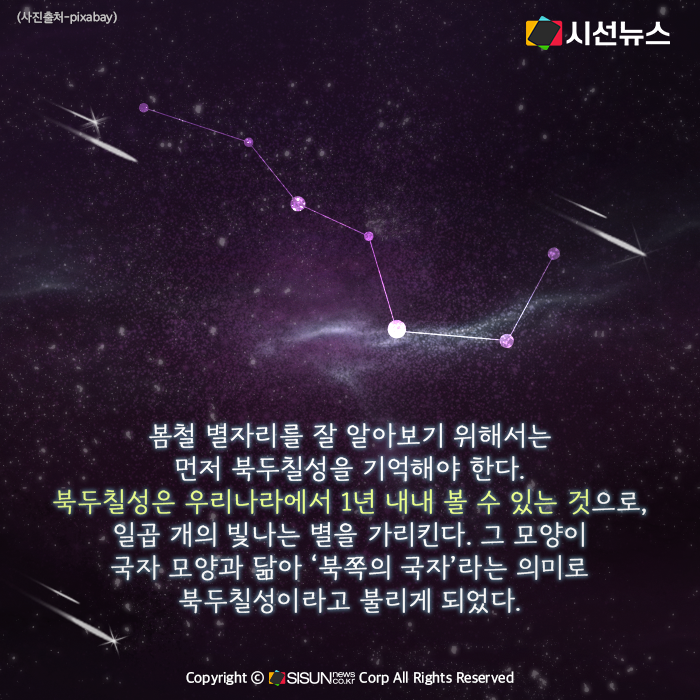 봄철 별자리를 잘 알아보기 위해서는 먼저 북두칠성을 기억해야 한다. 북두칠성은 우리나라에서 1년 내내 볼 수 있는 것으로, 오래전부터 북쪽의 길잡이로 알려져 있다. 일곱 개의 빛나는 별을 가리키는데, 그 모양이 국자 모양과 닮아 ‘북쪽의 국자’라는 의미로 북두칠성이라고 불리게 되었다.