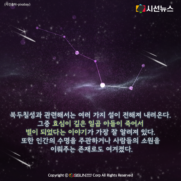 북두칠성과 관련해서는 여러 가지 설이 전해져 내려온다. 그중 효심이 깊은 일곱 아들이 죽어서 별이 되었다는 이야기가 가장 잘 알려져 있다. 또한 인간의 수명을 주관하거나 사람들의 소원을 이뤄주는 존재로도 여겨졌다. 청동기 시대와 고구려 사람들의 유물에서도 북두칠성 그림을 찾을 수 있다.