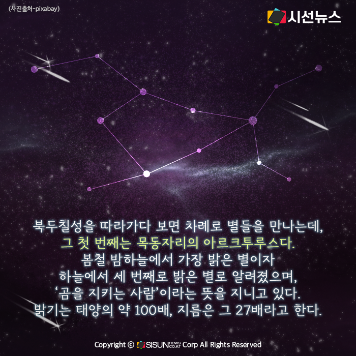 북두칠성을 따라가다 보면 차례로 별들을 만나는데, 그 첫 번째는 목동자리의 아르크투루스다. 봄철 밤하늘에서 가장 밝은 별이자 하늘에서 세 번째로 밝은 별로 알려졌으며, ‘곰을 지키는 사람’이라는 뜻을 지니고 있다. 밝기는 태양의 약 100배, 지름은 그 27배라고 한다.