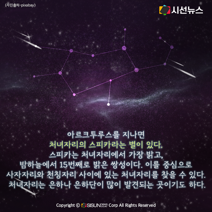 아르크투루스를 지나면 처녀자리의 스피카라는 별이 있다. 스피카는 처녀자리에서 가장 밝고, 밤하늘에서 15번째로 밝은 쌍성이다. 이를 중심으로 사자자리와 천칭자리 사이에 있는 처녀자리를 찾을 수 있다. 처녀자리는 은하나 은하단이 많이 발견되는 곳이기도 하다.
