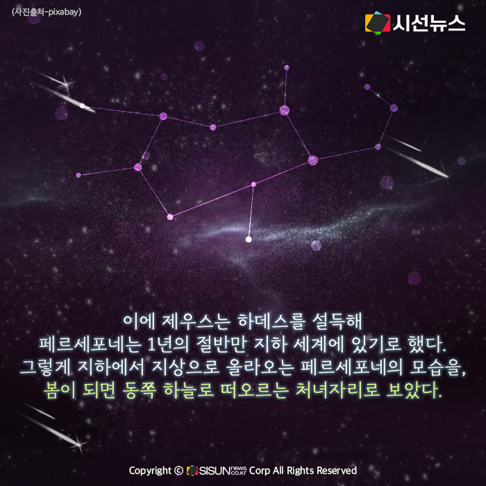 페르세포네에 얽힌 이야기는 지하 세계의 신 하데스가 아름다운 그를 납치한 데서 시작된다. 이후 데메테르는 슬픔에 빠져 대지가 황폐해지기에 이르렀고, 제우스는 하데스를 설득해 페르세포네는 1년의 절반만 지하 세계에 있기로 했다. 그렇게 지하에서 지상으로 올라오는 페르세포네의 모습을, 봄이 되면 동쪽 하늘로 떠오르는 처녀자리로 보았다.