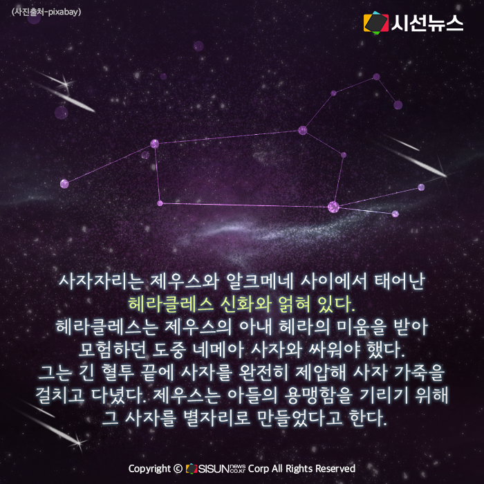 사자자리는 제우스와 알크메네 사이에서 태어난 헤라클레스 신화와 얽혀 있다. 헤라클레스는 제우스의 아내 헤라의 미움을 받아 모험하던 도중 네메아 사자와 싸워야 했다. 그는 긴 혈투 끝에 사자를 완전히 제압해 사자 가죽을 걸치고 다녔다. 제우스는 아들의 용맹함을 기리기 위해 그 사자를 별자리로 만들었다고 한다.