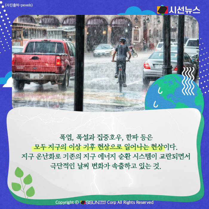 시선뉴스=박진아 기자 / 디자인=김선희 proㅣ폭염, 폭설과 집중호우, 한파 등은 모두 지구의 이상 기후 현상으로 일어나는 현상이다. 지구 온난화로 기존의 지구 에너지 순환 시스템이 교란되면서 극단적인 날씨 변화가 속출하고 있는 것.