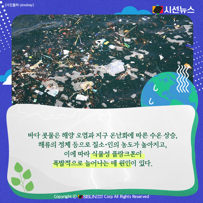 첫 번째 신조어. ‘바다 콧물’이다. 바다가 무슨 콧물?!바다 콧물은 식물성 플랑크톤이 지나치게 많이 번식해 녹색띠를 형성하는 녹조가 심해지는 현상을 뜻하는데, 식물성 플랑크톤이 배출하는 점액물질(해양 점액)이 바다 표면을 뒤덮는 데서 붙여진 명칭이다.