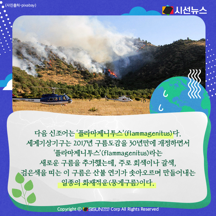 다음 신조어는 ‘플라마제니투스’(flammagenitus)다. 세계기상기구는 2017년 구름도감을 30년만에 개정하면서 ‘플라마제니투스’(flammagenitus)라는 새로운 구름을 추가했는데, 주로 회색이나 갈색, 검은색을 띠는 이 구름은 산불 연기가 솟아오르며 만들어내는 일종의 화재적운(뭉게구름)이다. 과거에도 화재적운은 있었지만, 산불이 잦아지면서 화재적운이 생기는 횟수가 늘어나자 세계기상기구가 정식 구름으로 인정한 것이다.
