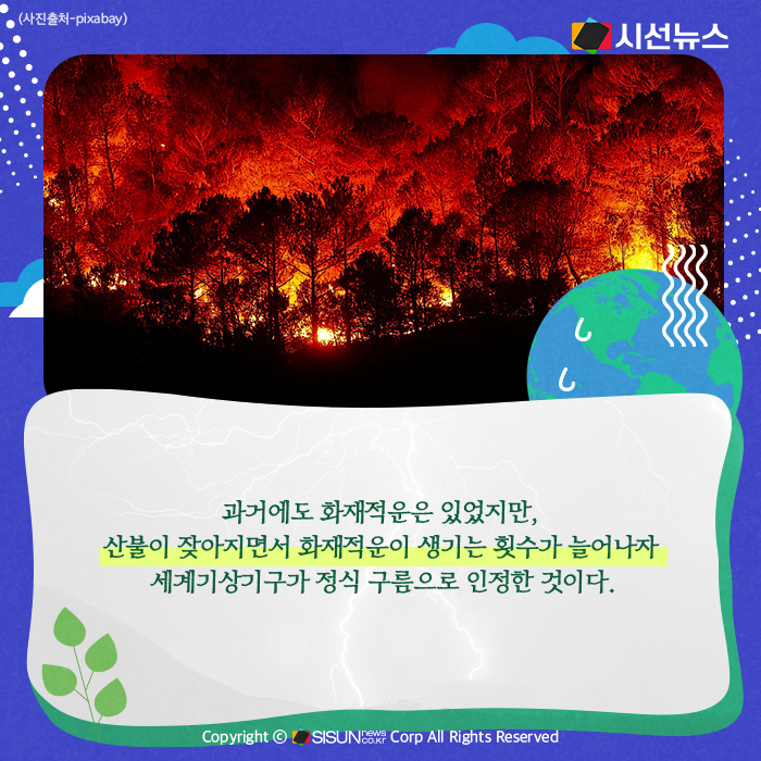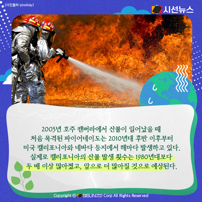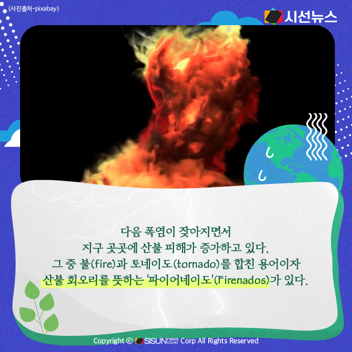 다음 폭염이 잦아지면서 지구 곳곳에 산불 피해가 증가하고 있다. 그 중 불(fire)과 토네이도(tornado)를 합친 용어이자 산불 회오리를 뜻하는 ‘파이어네이도’(Firenados)가 있다. 2003년 호주 캔버라에서 산불이 일어났을 때 처음 목격된 파이어네이도는 2010년대 후반 이후부터 미국 캘리포니아와 네바다 등지에서 해마다 발생하고 있다. 실제로 캘리포니아의 산불 발생 횟수는 1980년대보다 두 배 이상 많아졌고, 앞으로 더 많아질 것으로 예상된다.