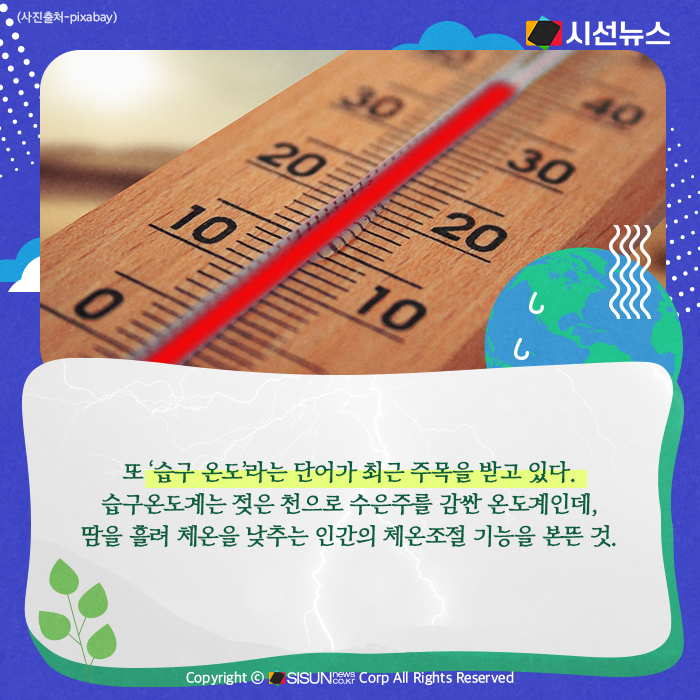 또 ‘습구 온도’라는 단어가 최근 주목을 받고 있다. 습구온도계는 젖은 천으로 수은주를 감싼 온도계인데, 땀을 흘려 체온을 낮추는 인간의 체온조절 기능을 본뜬 것. 인간이 견딜 수 있는 한계치는 습구온도 35도라고 알려져 있다. 습구온도가 이 지점을 웃돌면 땀으로 체온을 식힐 수가 없고, 과학자들은 습구온도 35도에서는 6시간 이상 버티기 어려울 것으로 추정한다.