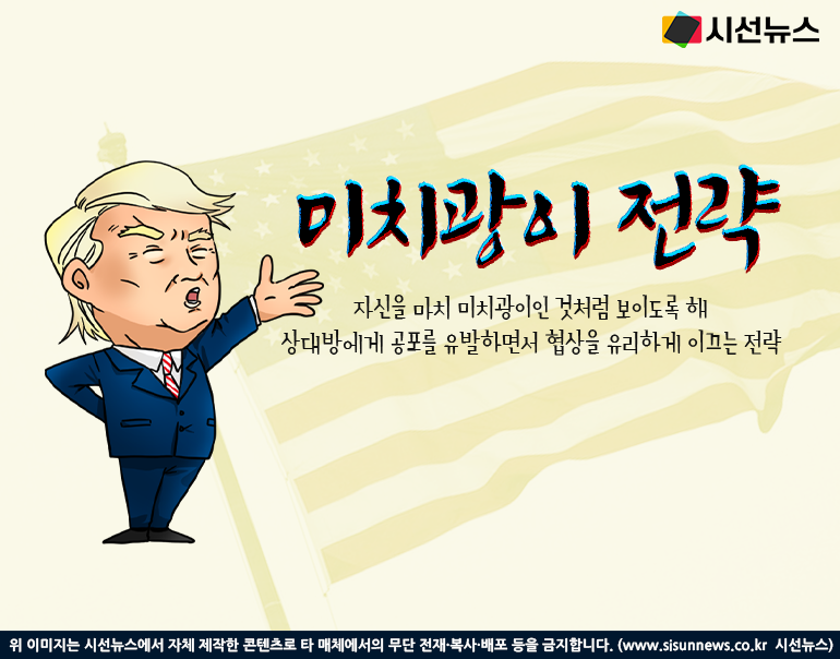 ‘미치광이 전략’이란 자신을 마치 미치광이인 것처럼 보이도록 해 상대방에게 공포를 유발하면서 협상을 유리하게 이끄는 전략을 말한다. ‘나는 예측불가하며, 비이성적이고, 무모한 행동을 할 수 있다’는 인식을 상대에게 심어 원하는 바를 이뤄낸다는 것이다.